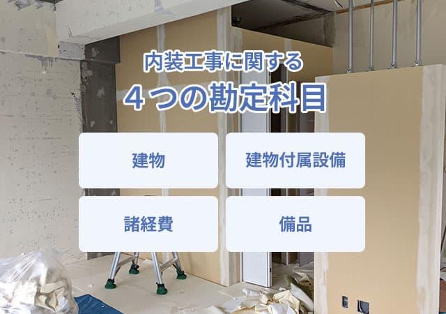 店舗内装工事の勘定科目4つ(建物、建物付属設備、諸経費、備品)について、例を挙げながら分かりやすく解説します。仕訳する際の見分け方や考え方のポイントについてもまとめています。