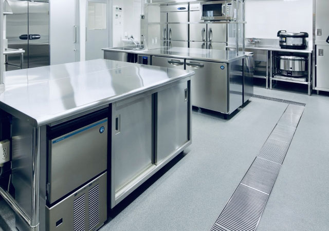 ウェットキッチンとは、床面に防水工事を施した厨房のことです。水を大量に流しながら清掃できるので、油汚れなど頑固な汚れも落としやすいという特長があります。