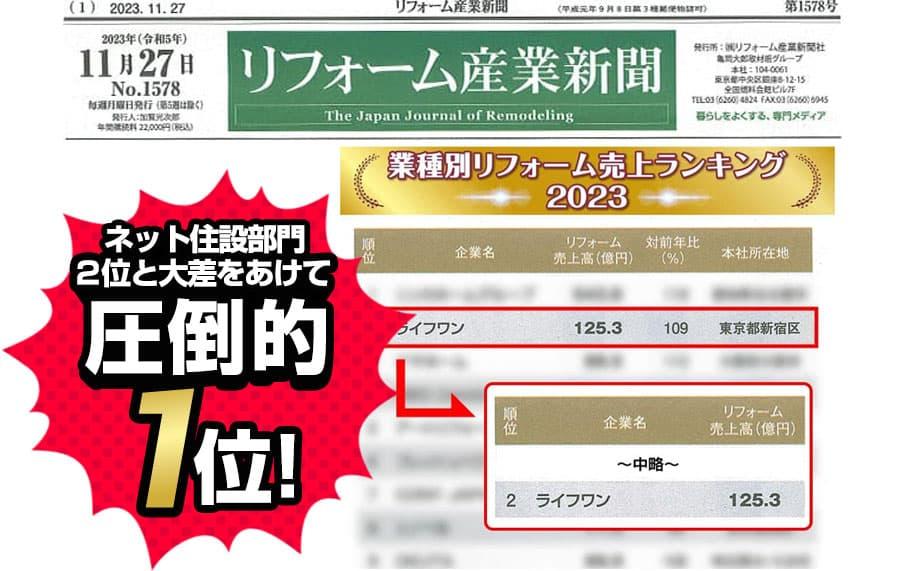 リフォーム産業新聞(2023年11月27日発行)の「業種別リフォーム売上ランキング2023」において、総合リフォーム店部門で当社が2位にランクイン。