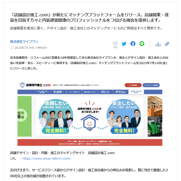 2023年7月14日、店舗設計施工.comサービスのリリースに伴い、メディア関係者に対してプレスリリース配信を行いました。プレスリリースは下記リンクからご覧いただけます。ぜひご覧ください。 「店舗設計施工.com」が新たにマッチングプラットフォームをリリース、店舗開業・改装を目指す方々と内装建築関連のプロフェッショナルをつなげる機会を提供します。 | PR TIMES(2023年7月14日) 戻る